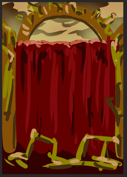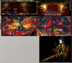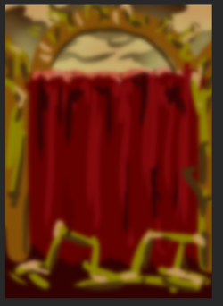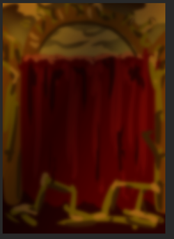 Вы не поверите, но фон делался буквально так же, как и в случе Родионки. Начальная грубая интерпретация фона из боя с аномалькой -- золотистый кружок над водопадом из крови, золотистые же ветки снизу и стены. Подобие желтовато-оранжевого неба. Смотрим: